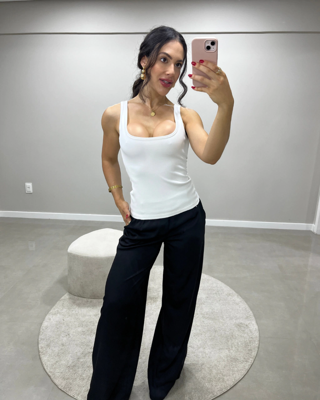 Calça com cós alto e corte reto (wide leg).