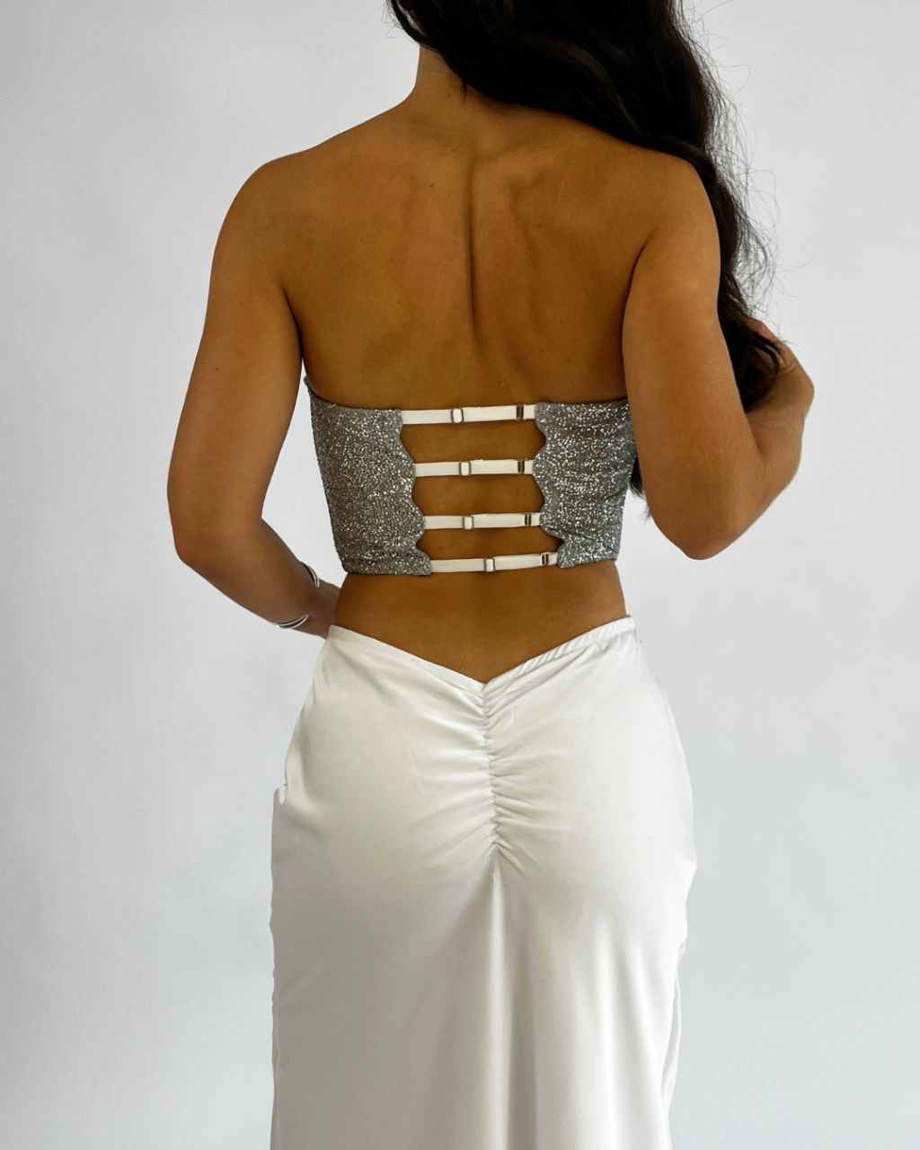 Corset meia taça tomara que caia, com tecido de aplicação de glitter.