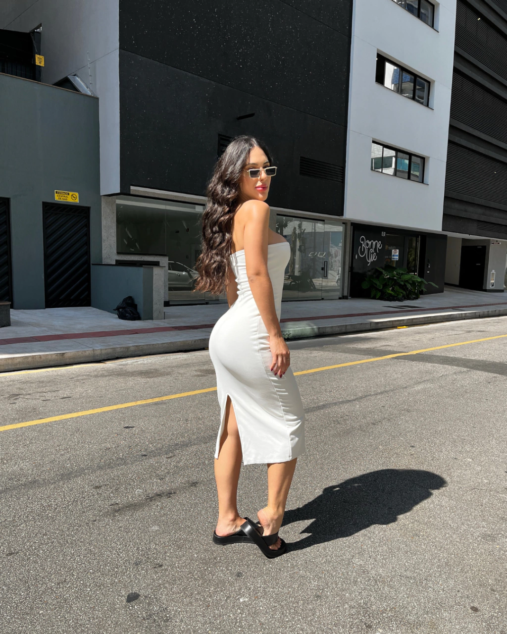 Vestido midi tomara que caia, com fenda na parte de trás.